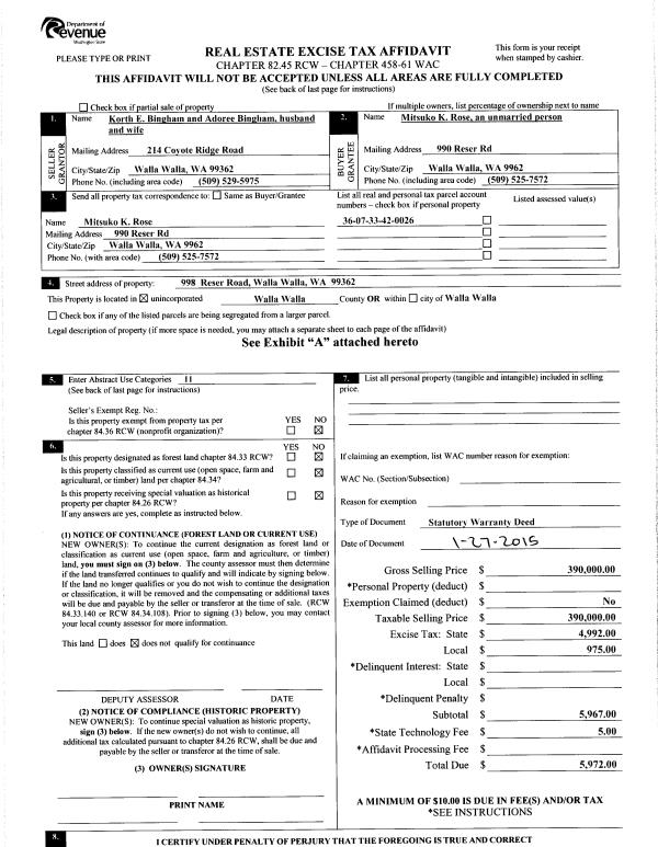 | 1 | 01/27/2015 | SWD | STATUTORY WARRANTY DEED | BINGHAM KORTH E | ROSE MITSUKO K | | | $390,000.00 | 127329 | 2015-00680 |