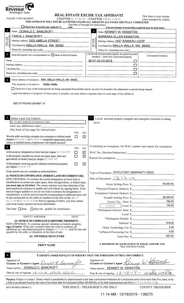 | 1 | 12/18/2019 | SWD | STATUTORY WARRANTY DEED | BANCROFT DONALD C & TANYA | KENISTON KENNEY W & BARBARA E | | | $60,000.00 | 138270 | 2019-10490 |