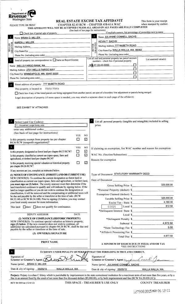 | 1 | 05/06/2015 | SWD | STATUTORY WARRANTY DEED | MILLER BRIAN D & KAREN J | SACHS KEVIN T & JULIANNE CONNELL | | | $325,000.00 | 127908 | 2015-03797 |