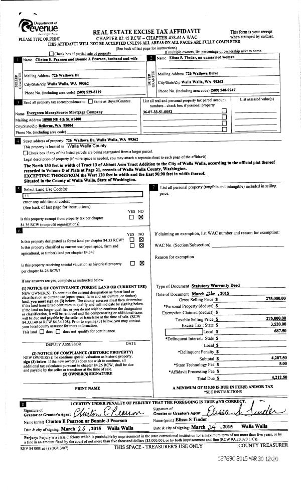 | 1 | 03/30/2015 | SWD | STATUTORY WARRANTY DEED | PEARSON CLINTON E & BONNIE J | TINDER ELISSA S | | | $275,000.00 | 127690 | 2015-02585 |