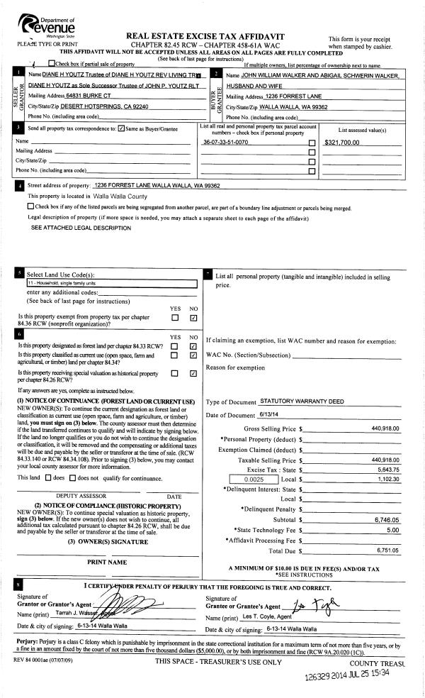 | 3 | 07/25/2014 | SWD | STATUTORY WARRANTY DEED | YOUTZ DIANE H REV LIVING TRUST | WALKER JOHN WILLIAM & ABIGAIL SCHWERIN | | | $440,918.00 | 126329 | 2014-05272 |