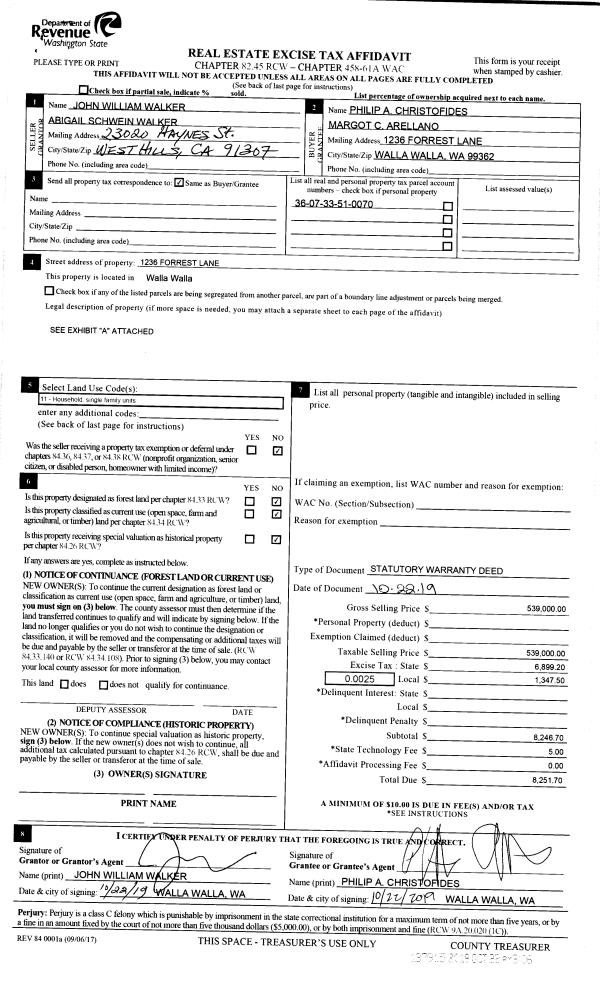 | 2 | 10/22/2019 | SWD | STATUTORY WARRANTY DEED | WALKER JOHN WILLIAM & ABIGAIL SCHWERIN | CHRISTOFIDES PHILIP A | | | $539,000.00 | 137915 | 2019-08472 |