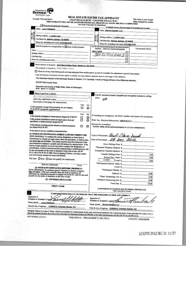 | 6 | 12/31/2012 | QCD | QUIT CLAIM DEED | STEINBACH, LAURA J | BONNIE ESCAPES LLC | | | $0.00 | 123255 | 2012-11709 |