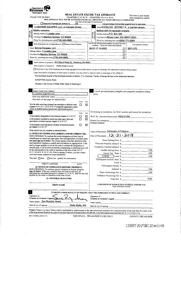 | 4 | 12/21/2017 | FREC | FORFEITURE OF REAL ESTATE CONT | GOODLOW JEFFREY R | BONNIE ESCAPES LLC | | | $0.00 | 133857 | 2017-10310 |