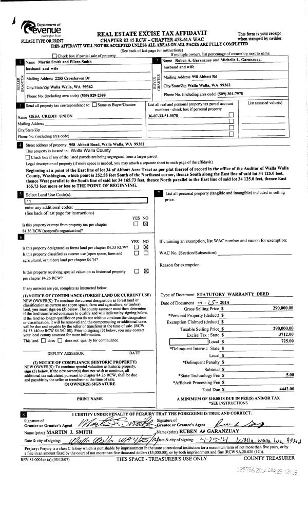 | 2 | 04/29/2014 | WARRANTY D | WARRANTY DEED | SMITH EILEEN P & MARTIN J | GARANZUAY RUBEN A & MICHELLE L | | | $290,000.00 | 125786 | 201-02880 |