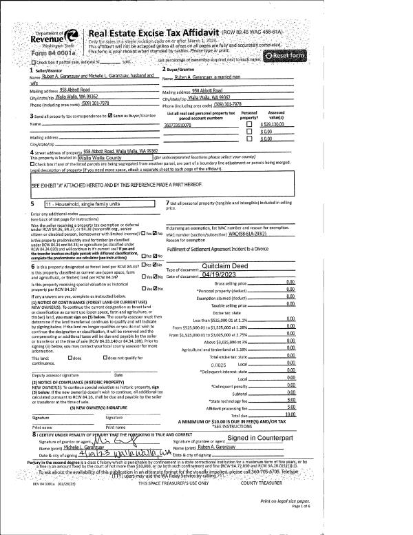 | 1 | 04/27/2023 | QCD | QUIT CLAIM DEED | GARANZUAY RUBEN A & MICHELLE L | GARANZUAY RUBEN A | | | | 145711 | 2023-02214 |