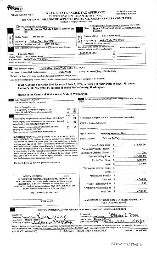 | 1 | 12/27/2017 | SWD | STATUTORY WARRANTY DEED | BETZIER DONALD | MOORE STEVEN C & BLANCA E | | | $310,000.00 | 133885 | 2017-10437 |