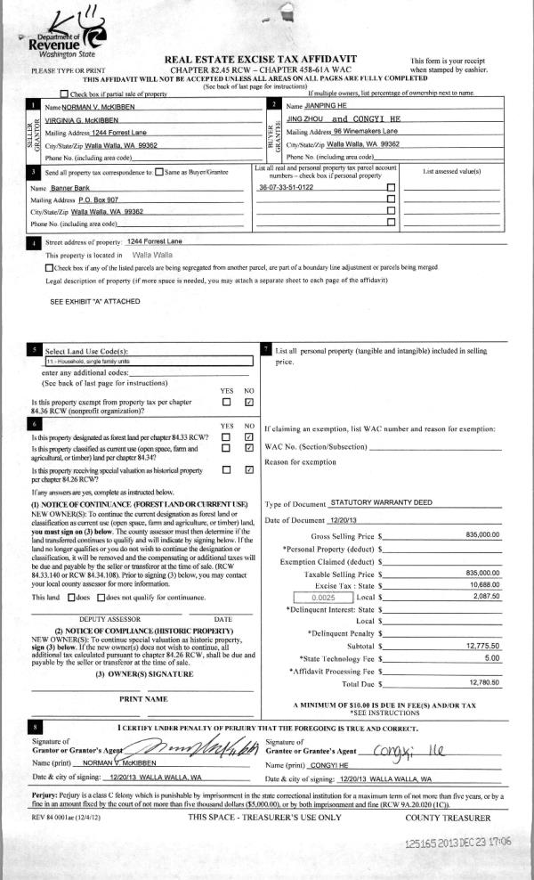 | 1 | 12/23/2013 | WARRANTY D | WARRANTY DEED | MC KIBBEN NORMAN & VIRGINIA | HE JIANPING & JING ZHOU | | | $835,000.00 | 125165 | 2013-12222 |