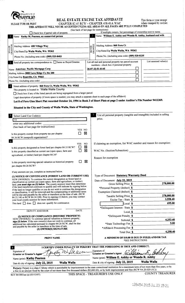 | 3 | 07/23/2015 | SWD | STATUTORY WARRANTY DEED | PEARSON KATHY M | ASHBY WILLIAM E & WANDA R | | | $278,000.00 | 128454 | 2015-06299 |