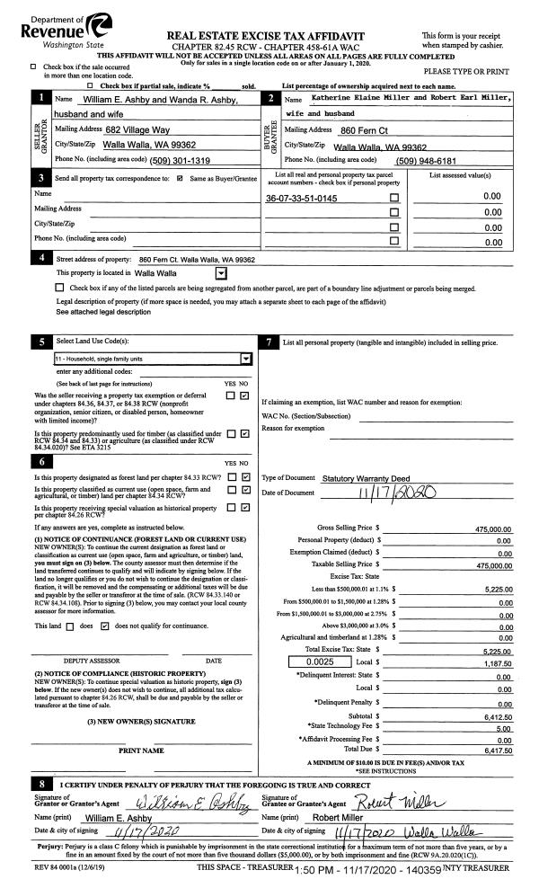 | 2 | 11/17/2020 | SWD | STATUTORY WARRANTY DEED | ASHBY WILLIAM E & WANDA R | MILLER KATHERINE ELAINE & ROBERT EARL | | | $475,000.00 | 140359 | 2020-12150 |
