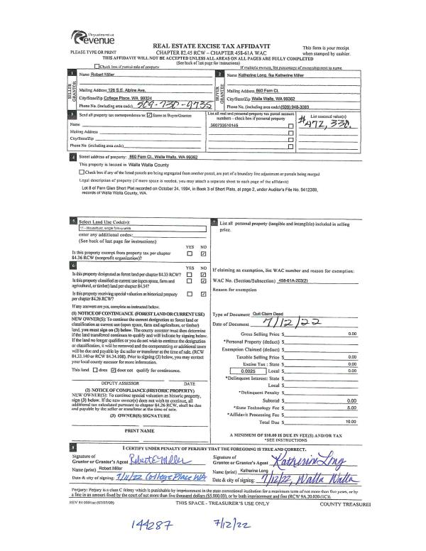 | 1 | 07/12/2022 | QCD | QUIT CLAIM DEED | MILLER KATHERINE ELAINE & ROBERT EARL | LONG KATHERINE | | | $0.00 | 144287 | 2022-05897 |