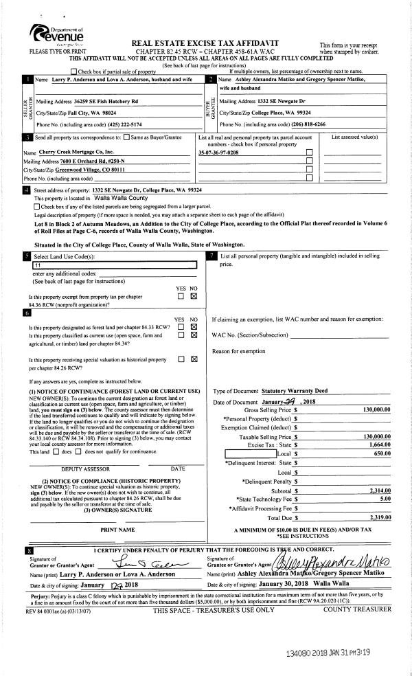 | 2 | 01/31/2018 | SWD | STATUTORY WARRANTY DEED | ANDERSON LARRY P & LOVA A | MATIKO GREGORY SPENCER & ASHLEY ALEXANDRA | | | $130,000.00 | 134080 | 2018-00872 |