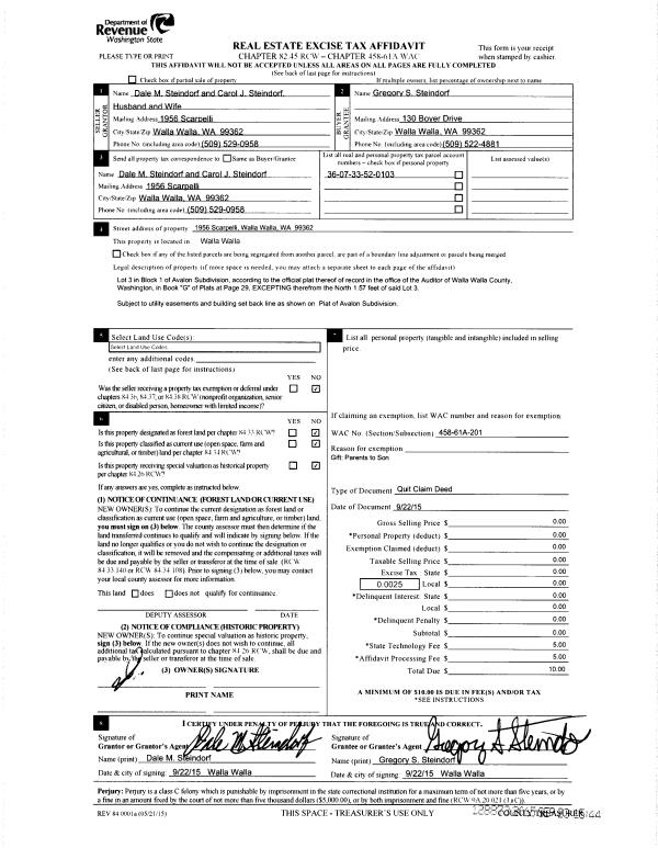 | Mailing Address: | STEINDORF GREGORY S 130 BOYER DR WALLA WALLA, WA 99362 | % Ownership: | 100.0000000000% |