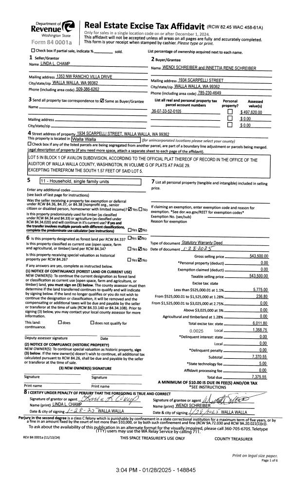 | 1 | 01/28/2025 | SWD | STATUTORY WARRANTY DEED | CHAMP LINDA L | SCHREIBER WENDI & INNETTIA RENE | | | $543,500.00 | 148845 | 2025-00459 |