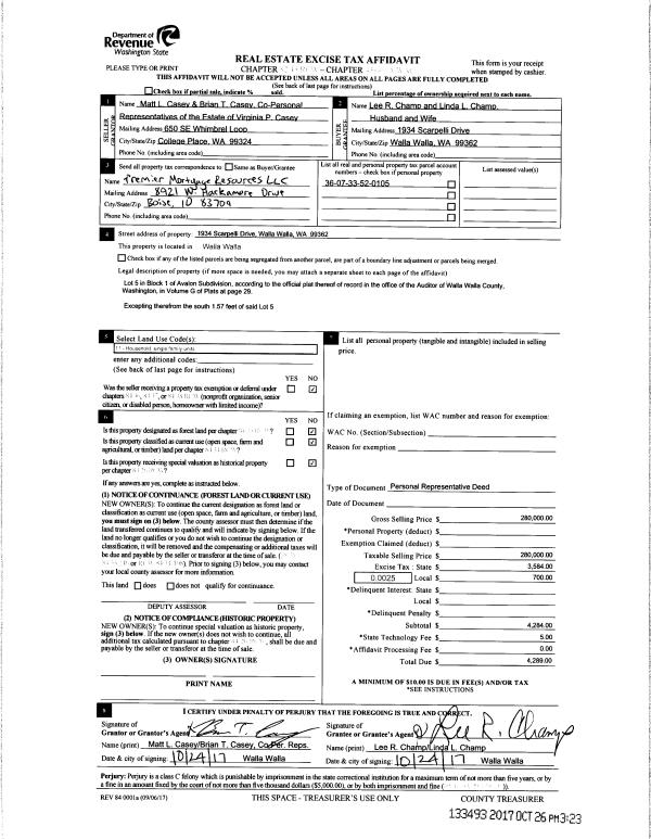 | 3 | 10/26/2017 | DPR | DEED OF PERSONAL REPRESENTATIVE | CASEY VIRGINIA P ESTATE OF | CHAMP LEE R & LINDA L | | | $280,000.00 | 133493 | 2017-08576 |