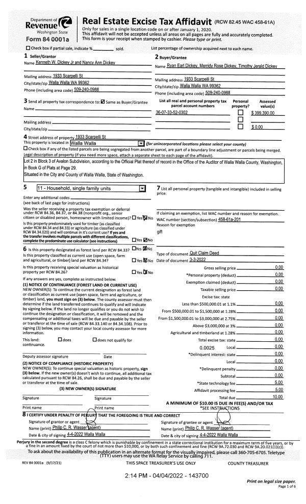 | Mailing Address: | RYAN EARL DICKEY ET AL 1933 SCARPELLI ST WALLA WALLA, WA 99362 | % Ownership: | 100.0000000000% |