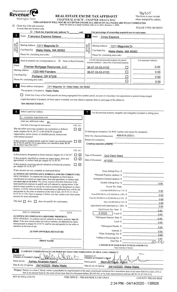 | 1 | 04/14/2020 | QCD | QUIT CLAIM DEED | SALAZAR FRANCISCO ESPARZA | ESPARZA CINDY | | 2-PARCELS | $0.00 | 138926 | 2020-03175 |