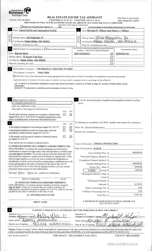 | 1 | 09/21/2018 | SWD | STATUTORY WARRANTY DEED | SCHOLL DAVID L & JACQUELINE | WILSON MICHAEL R & KARLYN J | | | $439,000.00 | 135594 | 2018-07891 |