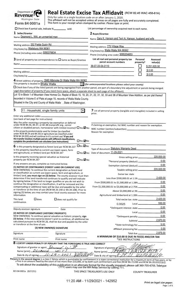 | 2 | 11/29/2021 | SWD | STATUTORY WARRANTY DEED | WITT DESMOND L | HANSON GARY K & TERRI A | | | $220,000.00 | 142952 | 2021-14044 |