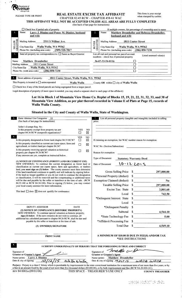 | 1 | 10/19/2015 | SWD | STATUTORY WARRANTY DEED | DIMINO LARRY J & PENNY M | DRUMHELLER MATTHEW & REBECCA | | | $297,000.00 | 129036 | 2015-09132 |