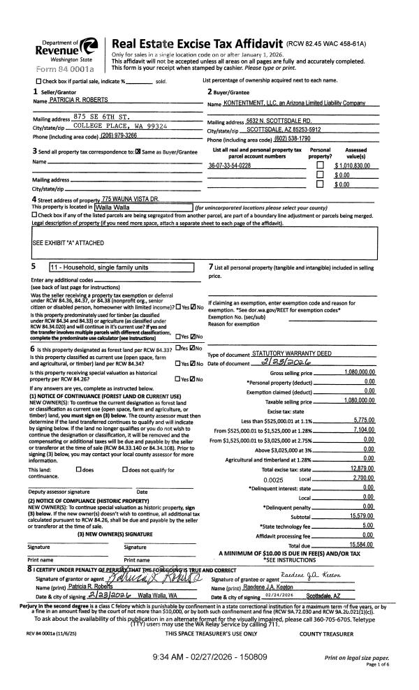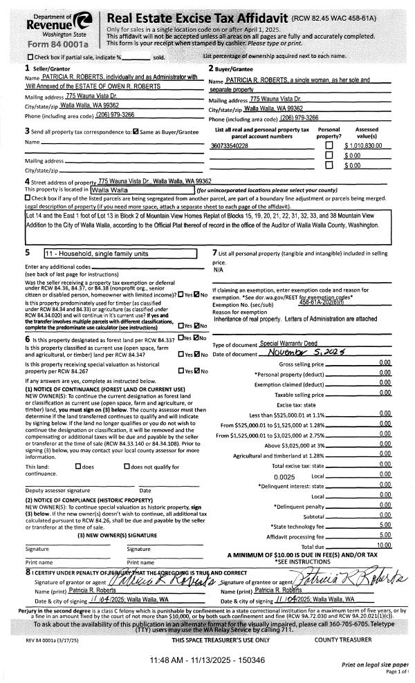 | Mailing Address: | 775 WAUNA VISTA DR WALLA WALLA, WA 99362 | % Ownership: | 100.0000000000% |