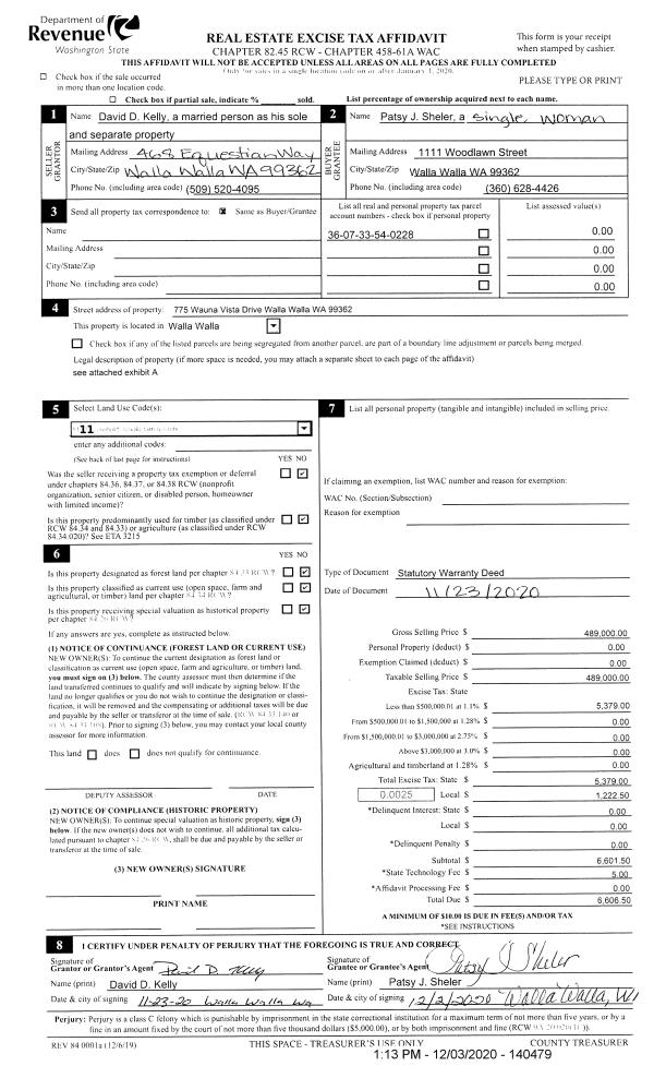 | 4 | 12/03/2020 | SWD | STATUTORY WARRANTY DEED | KELLY DAVID D | SHELER PATSY J | | | $489,000.00 | 140479 | 2020-12789 |