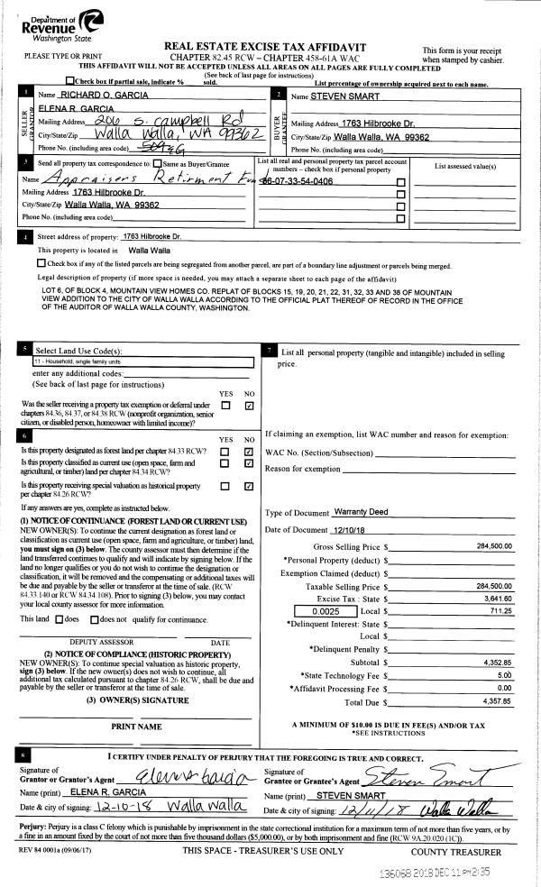 | 1 | 12/11/2018 | WARRANTY D | WARRANTY DEED | GARCIA RICHARD O | SMART STEVEN | | | $284,500.00 | 136068 | 2018-10240 |
