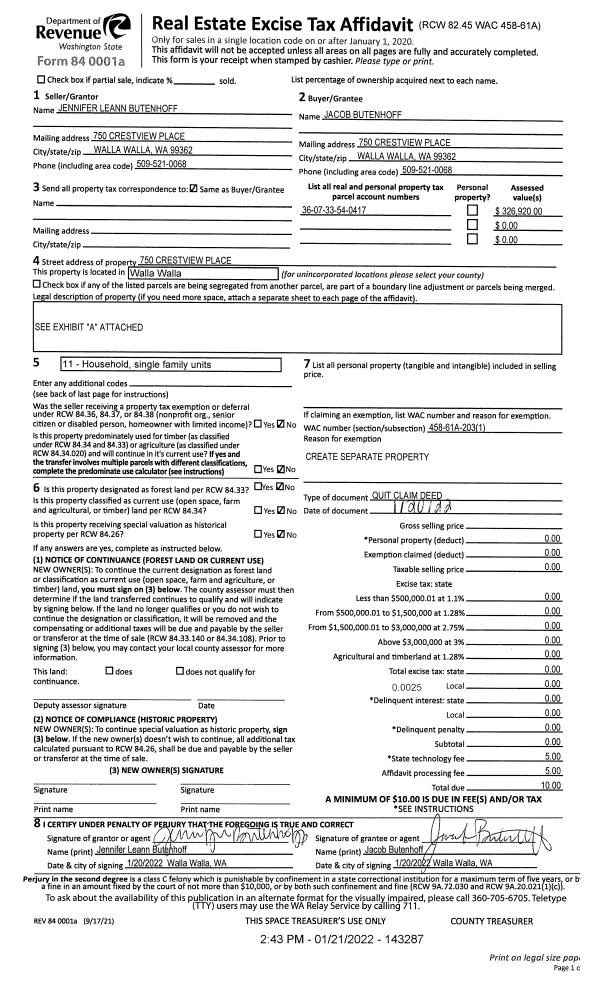 | 2 | 01/21/2022 | QCD | QUIT CLAIM DEED | BUTENHOFF JENNIFER LEANN | BUTENHOFF JACOB | | | | 143287 | 2022-00677 |