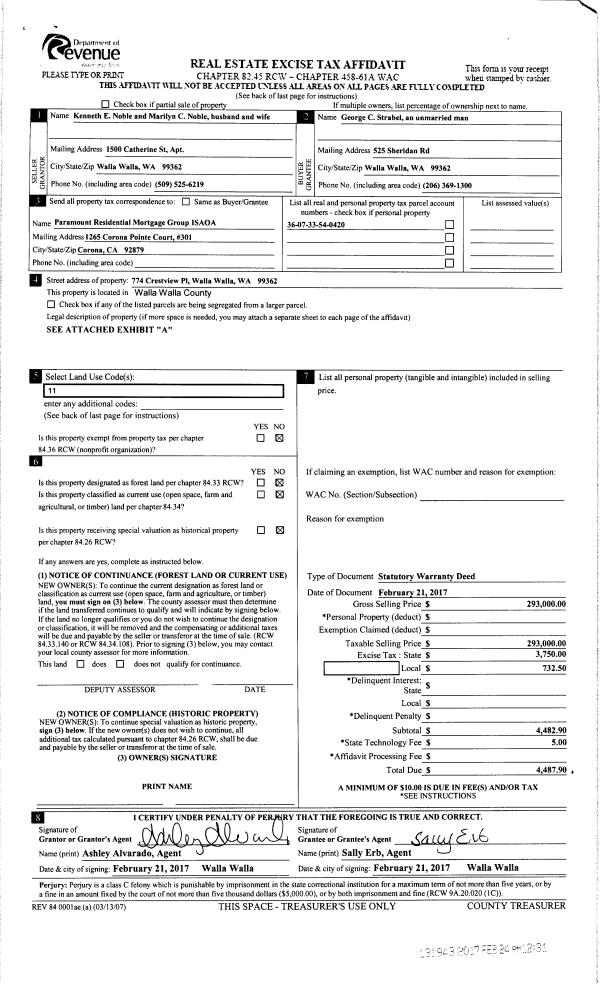 | 1 | 02/24/2017 | SWD | STATUTORY WARRANTY DEED | NOBLE KENNETH E | STRABEL GEORGE CLIFF | | | $293,000.00 | 131943 | 2017-01480 |
