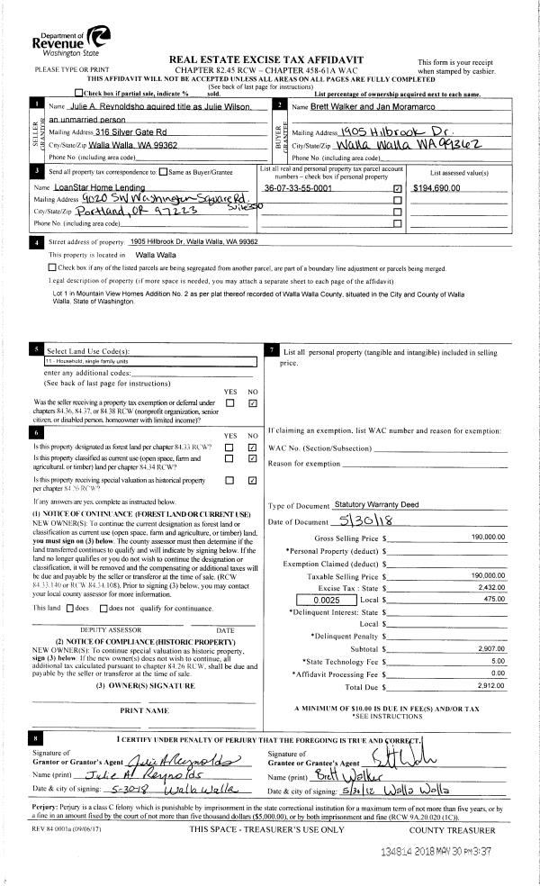 | 3 | 05/30/2018 | SWD | STATUTORY WARRANTY DEED | WILSON JULIE A | WALKER BRETT | | | $190,000.00 | 134814 | 2018-04286 |