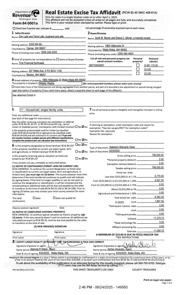 | 1 | 06/24/2025 | SWD | STATUTORY WARRANTY DEED | LALLY DON & TERRA | MORAN SCOTT M & DIANA C | | | $799,000.00 | 149583 | 2025-03571 |