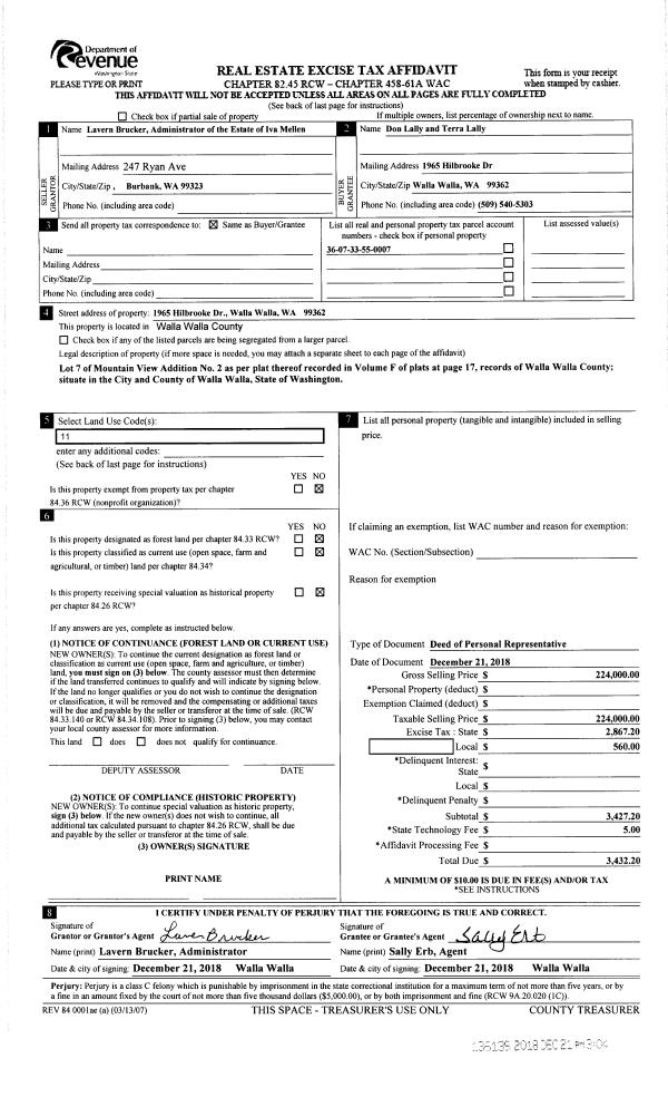 | 2 | 12/21/2018 | DPR | DEED OF PERSONAL REPRESENTATIVE | MELLEN IVA B ESTATE OF | LALLY DON & TERRA | | | $224,000.00 | 136139 | 2018-10563 |