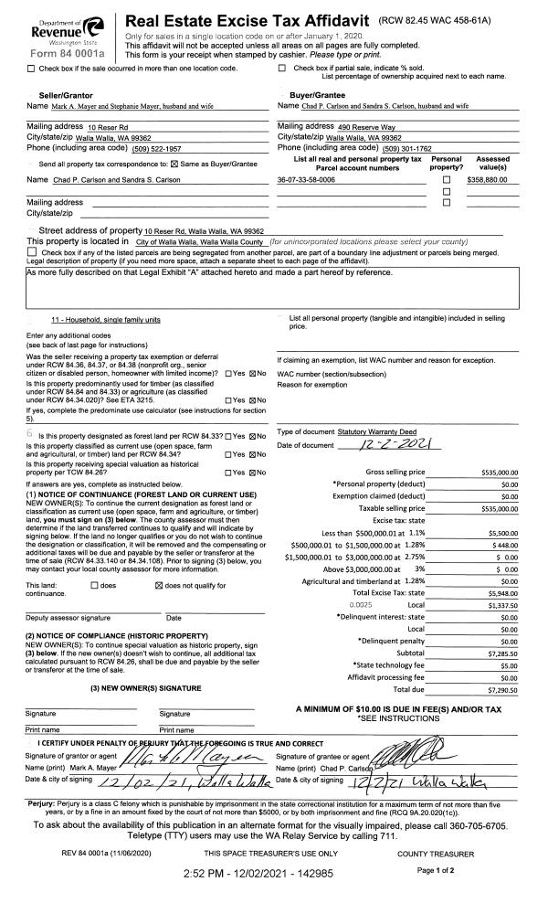 | 1 | 12/02/2021 | SWD | STATUTORY WARRANTY DEED | MAYER MARK A & STEPHANIE | CARLSON CHAD P & SANDRA S | | | $535,000.00 | 142985 | 2021-14243 |