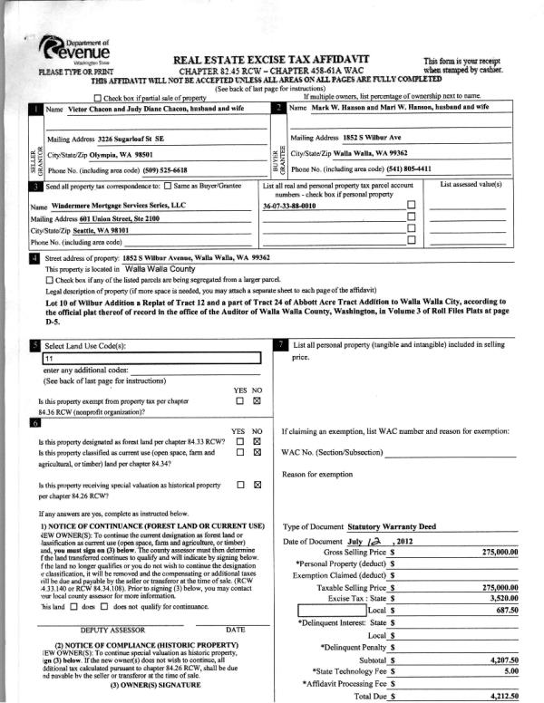 | 1 | 07/16/2012 | WARRANTY D | WARRANTY DEED | CHACON, VICTOR & JUDY D | HANSON, MARK W & MARI W | | | $275,000.00 | 122344 | 2012-06008 |