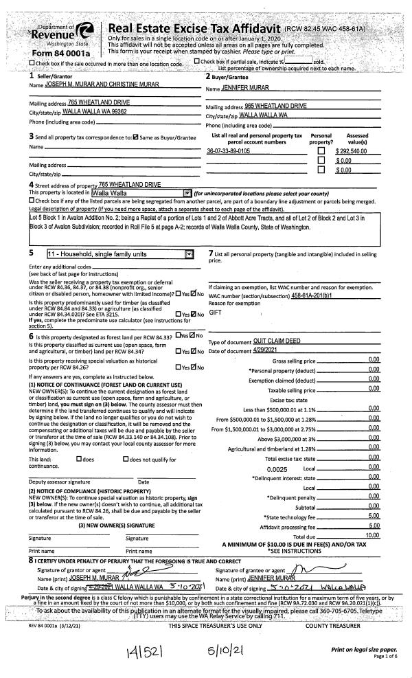 | 1 | 04/29/2021 | QCD | QUIT CLAIM DEED | MURAR JOSEPH M & CHRISTINE | MURAR JENNIFER | | | $0.00 | 141521 | 2021-05591 |
