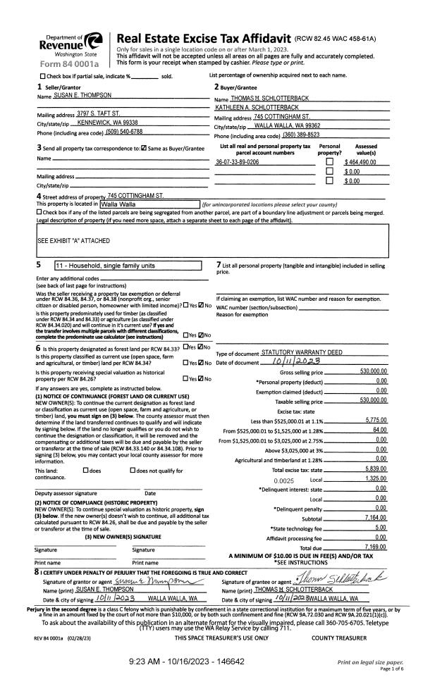 | 1 | 10/16/2023 | SWD | STATUTORY WARRANTY DEED | THOMPSON SUSAN E | SCHLOTTERBACK THOMAS M & KATHLEEN A | | | $530,000.00 | 146642 | 2023-06065 |