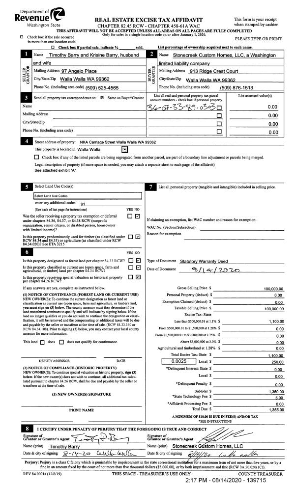 | 2 | 08/14/2020 | SWD | STATUTORY WARRANTY DEED | BARRY TIMOTHY D & KRISTINE L | STONECREEK CUSTOM HOMES LLC | | | $100,000.00 | 139715 | 2020-08097 |