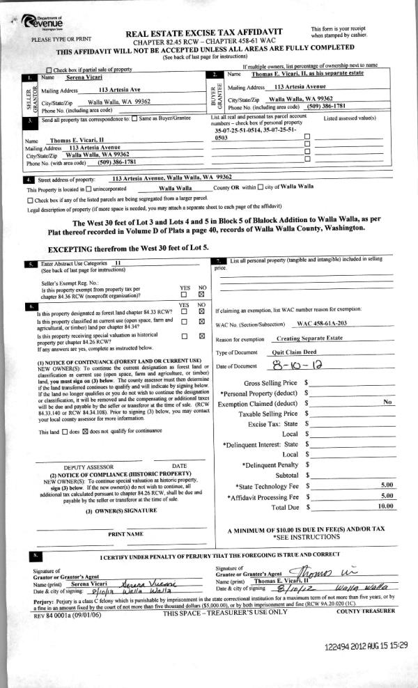 | 3 | 08/15/2012 | QCD | QUIT CLAIM DEED | VICARI, SERENA | VICARI, THOMAS E II | | | $0.00 | 122494 | 2012-06995 |