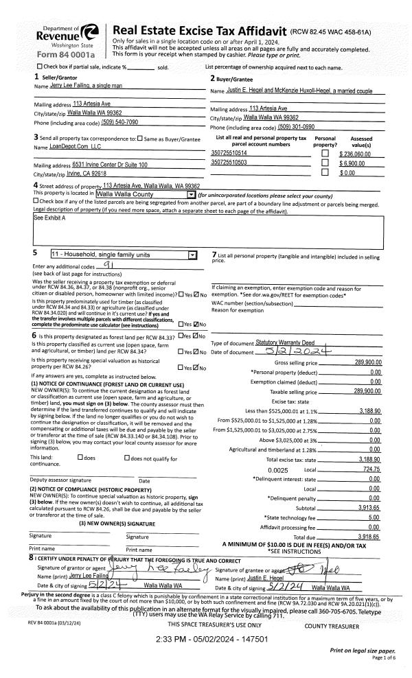 | 1 | 05/02/2024 | SWD | STATUTORY WARRANTY DEED | FAILING JERRY LEE | HEGEL JUSTIN E & MCKENZIE HUXOLL-HEGEL | | 2-PARCELS | $289,900.00 | 147501 | 2024-02285 |