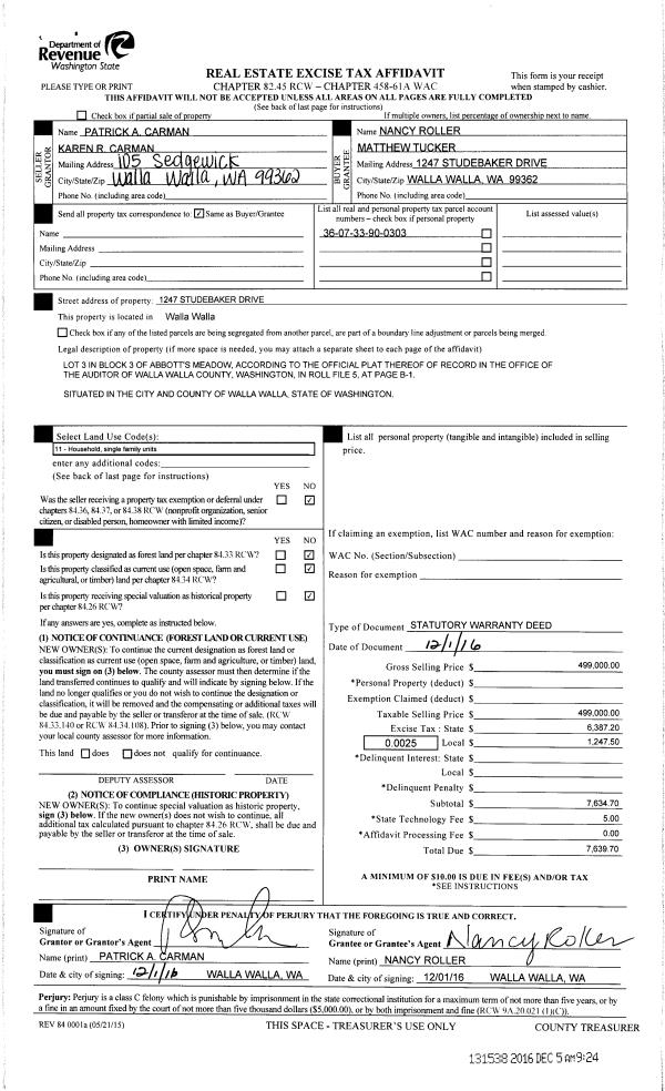 | 1 | 12/05/2016 | SWD | STATUTORY WARRANTY DEED | CARMAN PATRICK & KAREN | TUCKER MATTHEW | | | $499,000.00 | 131538 | 2016-09904 |