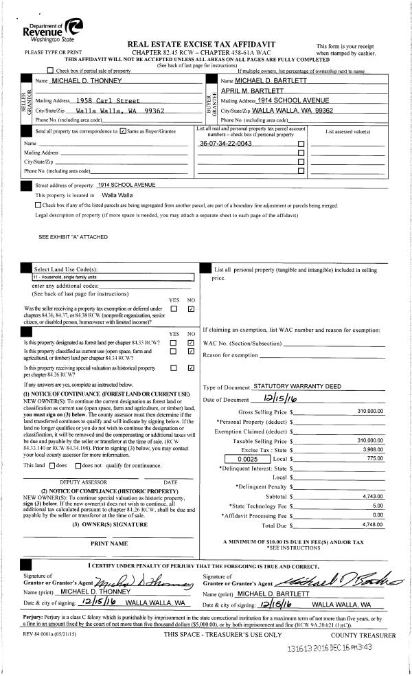 | 2 | 12/16/2016 | SWD | STATUTORY WARRANTY DEED | THONNEY MICHAEL D | BARTLETT MICHAEL D & APRIL M | | | $310,000.00 | 131613 | 2016-10384 |