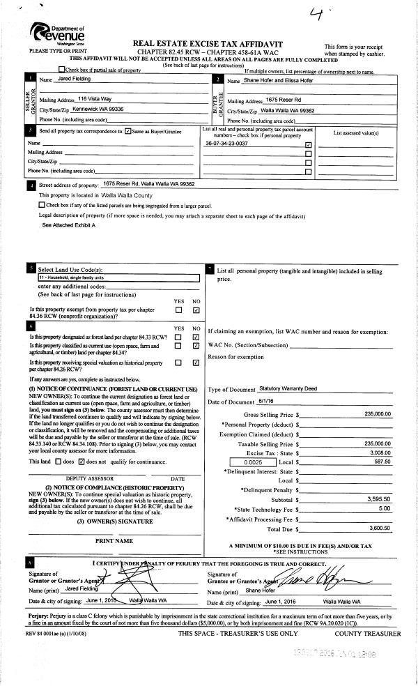 | 1 | 06/01/2016 | SWD | STATUTORY WARRANTY DEED | FIELDING JARED | HOFER SHANE & ELISSA | | | $235,000.00 | 130317 | 2016-04105 |
