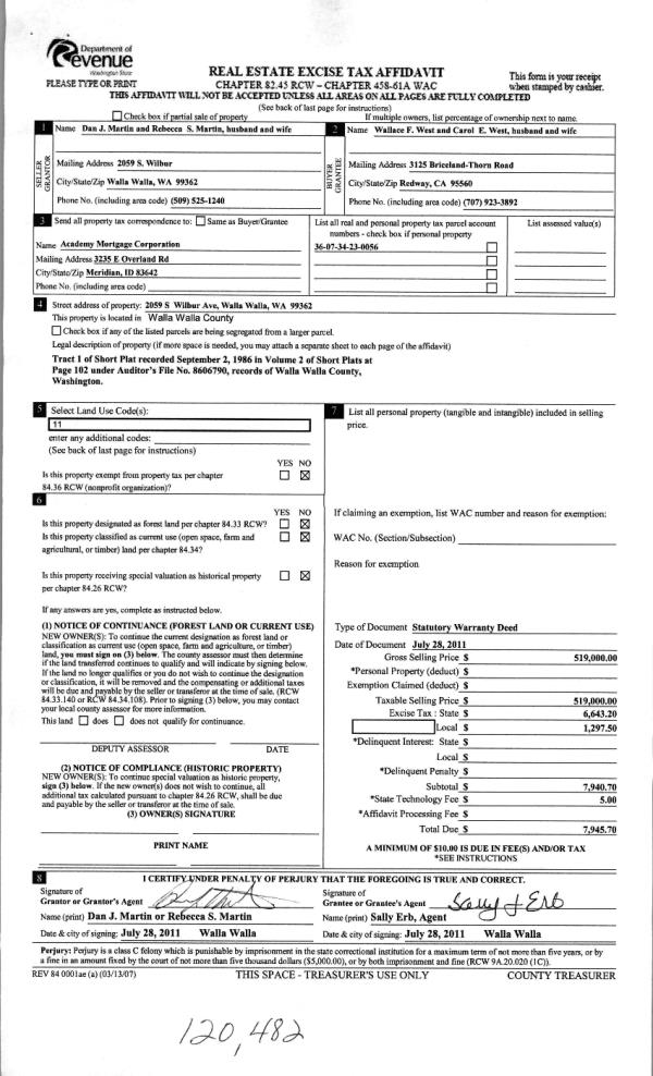 | 2 | 07/29/2011 | WARRANTY D | WARRANTY DEED | MARTIN, DAN J & REBECCA S | WEST, WALLACE & CAROL | | | $519,000.00 | 120482 | 2011-05924 |