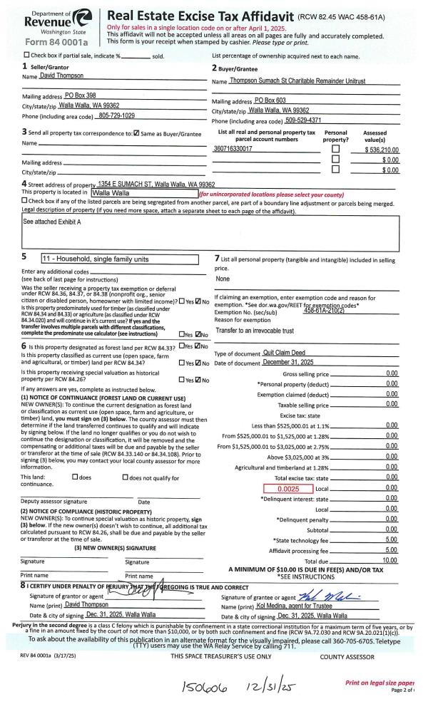| 1 | 12/31/2025 | QCD | QUIT CLAIM DEED | THOMPSON DAVID W | THOMPSON SUMACH STREET CHARITABLE REMAINDER UNITRUST | | | | 150606 | 2025-08050 |
