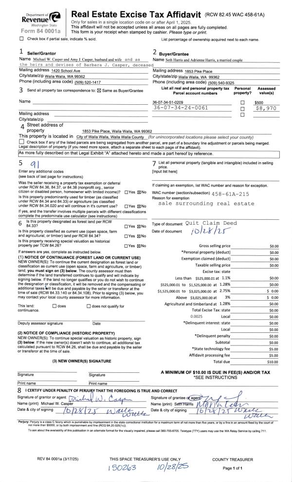 | 1 | 10/28/2025 | QCD | QUIT CLAIM DEED | CASPER MICHAEL W & AMY J | HARRIS SETH & ADRIENNE | | | | 150263 | 2025-06663 |