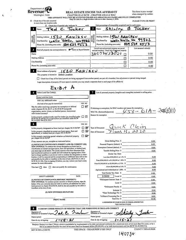 | 1 | 03/15/2020 | QCD | QUIT CLAIM DEED | TUCKER TED C | TUCKER SHIRLEY B | | | $0.00 | 140734 | 2021-00594 |