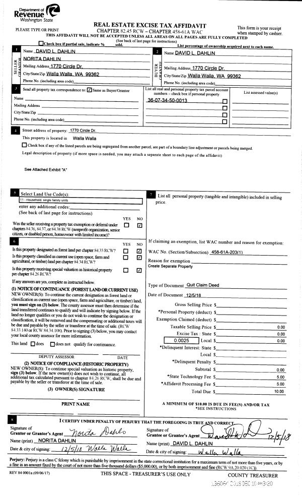 | 2 | 12/05/2018 | QCD | QUIT CLAIM DEED | DAHLIN DAVID L & NORITA E | DAHLIN DAVID L | | | $0.00 | 136064 | 2018-10204 |