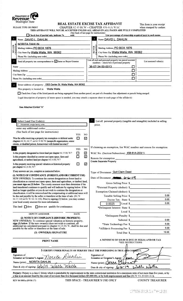 | 1 | 06/06/2019 | QCD | QUIT CLAIM DEED | DAHLIN NORITA E | DAHLIN DAVID L | | | | 137036 | 2019-03940 |