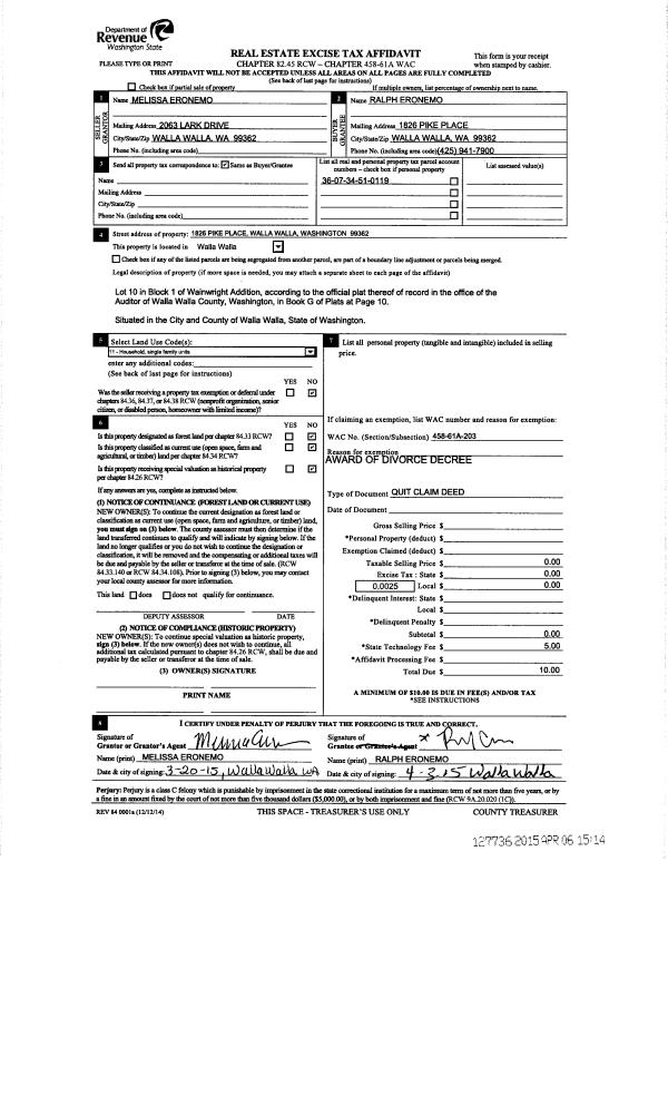 | 2 | 04/06/2015 | QCD | QUIT CLAIM DEED | ERONEMO MELISSA | ERONEMO RALPH | | | $0.00 | 127736 | 2015-02809 |