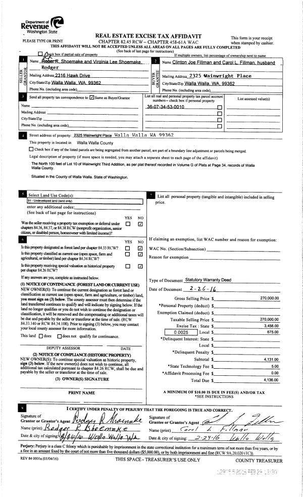 | 1 | 02/29/2016 | SWD | STATUTORY WARRANTY DEED | SHOEMAKE RODGER R & VIRGINIA | FILLMAN CLINTON JOE & CAROL L | | | $270,000.00 | 129755 | 2016-01527 |